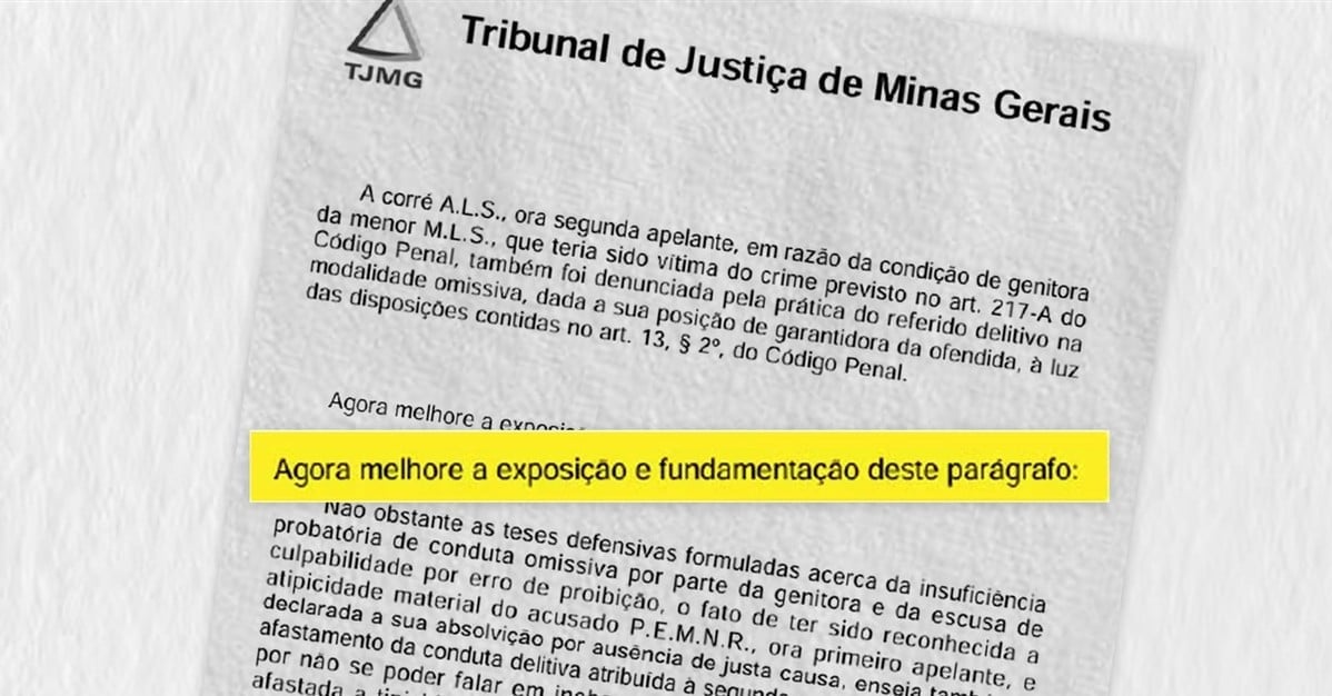 No voto sobre o caso do homem acusado de estupro contra criança, o magistrado se esqueceu de excluir a orientação para a IA modificar o texto; o TJMG ainda não se pronunciou.